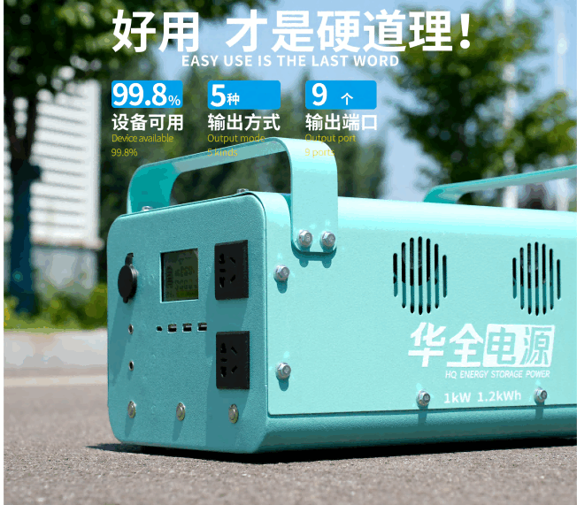 舉例來說,如華全HQDY-1000-A戶外電源,額定功率1000W,電量為1200Wh(≈1.2度電),而1度電可以讓電動(dòng)汽車跑5~8公里,這個(gè)距離足以應(yīng)付很多事了。